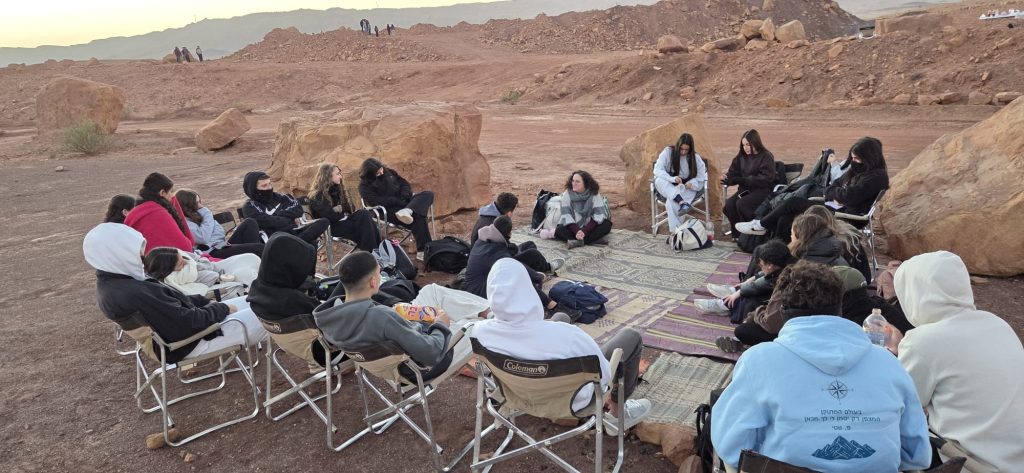 על מזרנים, תחת כיפת השמיים של המכתש, סביב מדורה מחממת, התלמידים שמעו הדרכת כוכבים וצפו בהם מקרוב דרך טלסקופים.